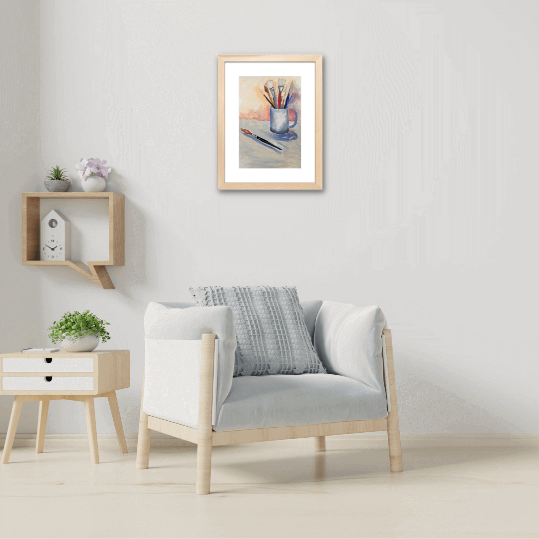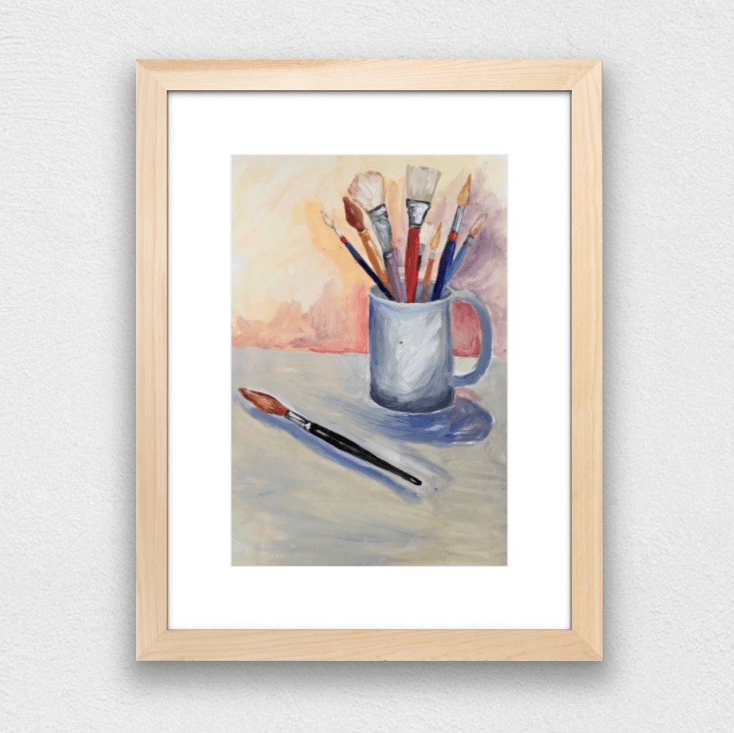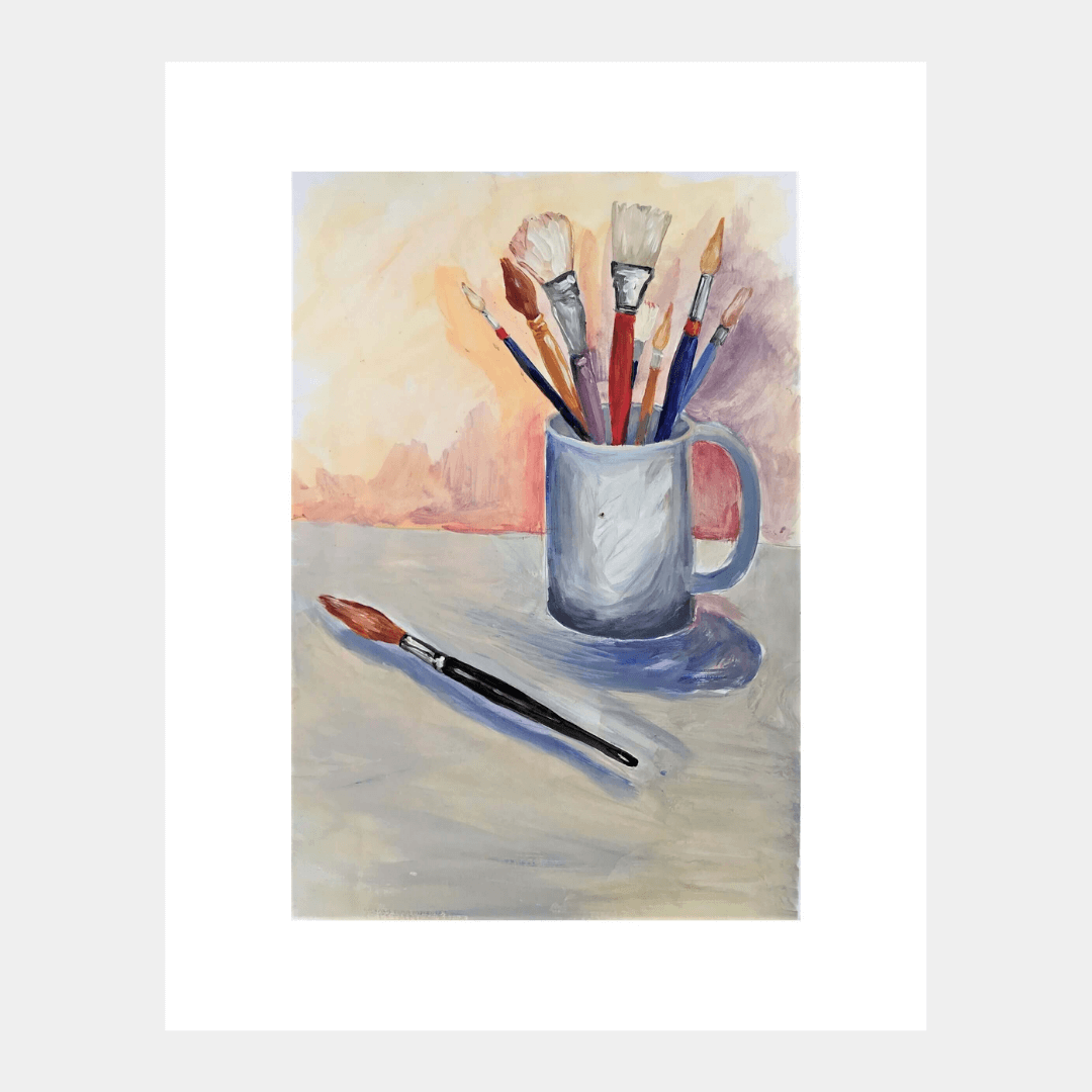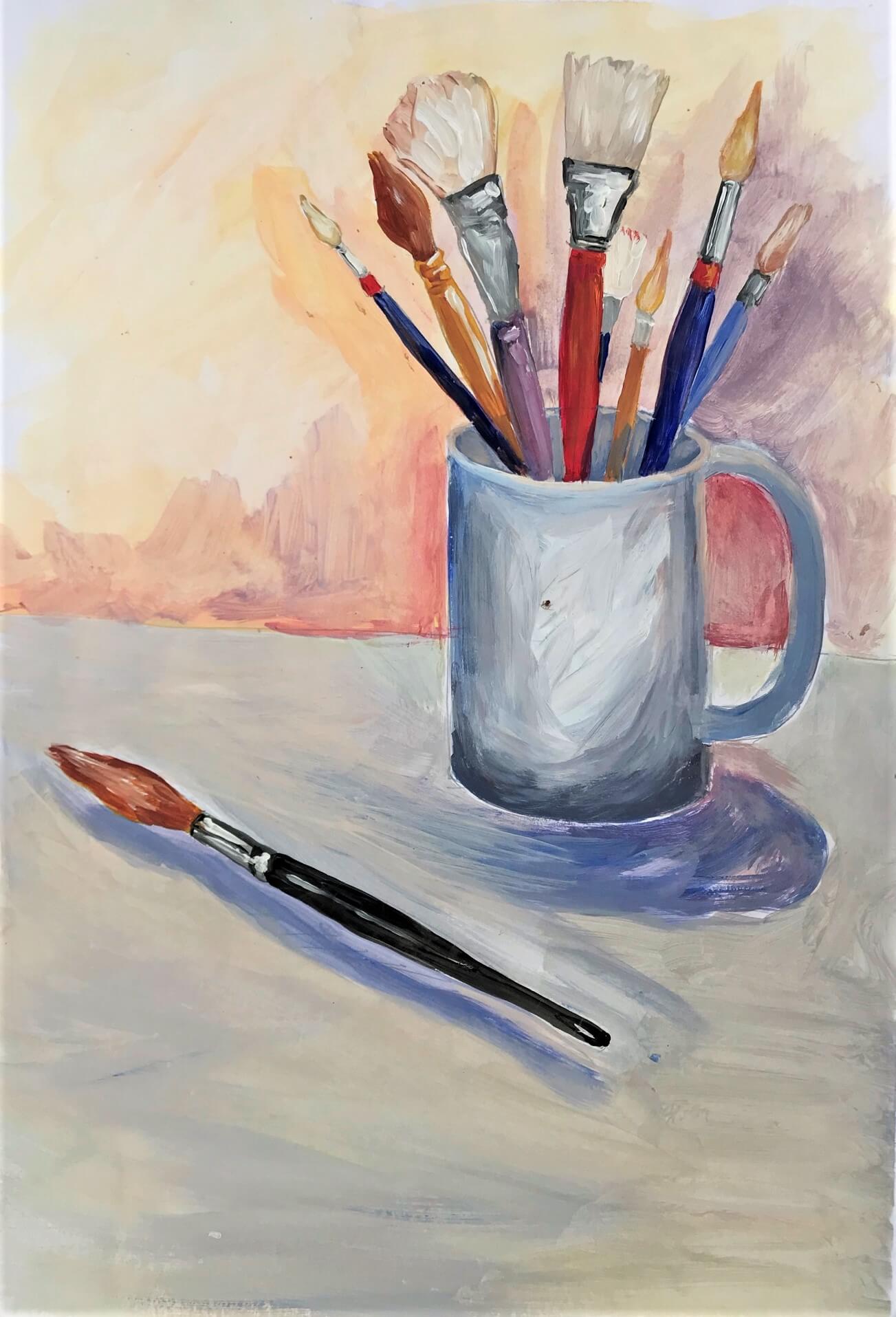 Descriere: Compoziția cuprinde, sub forma unei naturi statice, câteva dintre ustensilele de lucru ale unui pictor. Culorile utilizate sunt bazate pe griuri colorate și tonalități calde.
