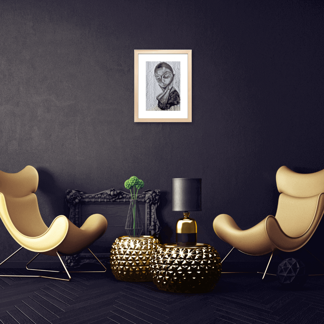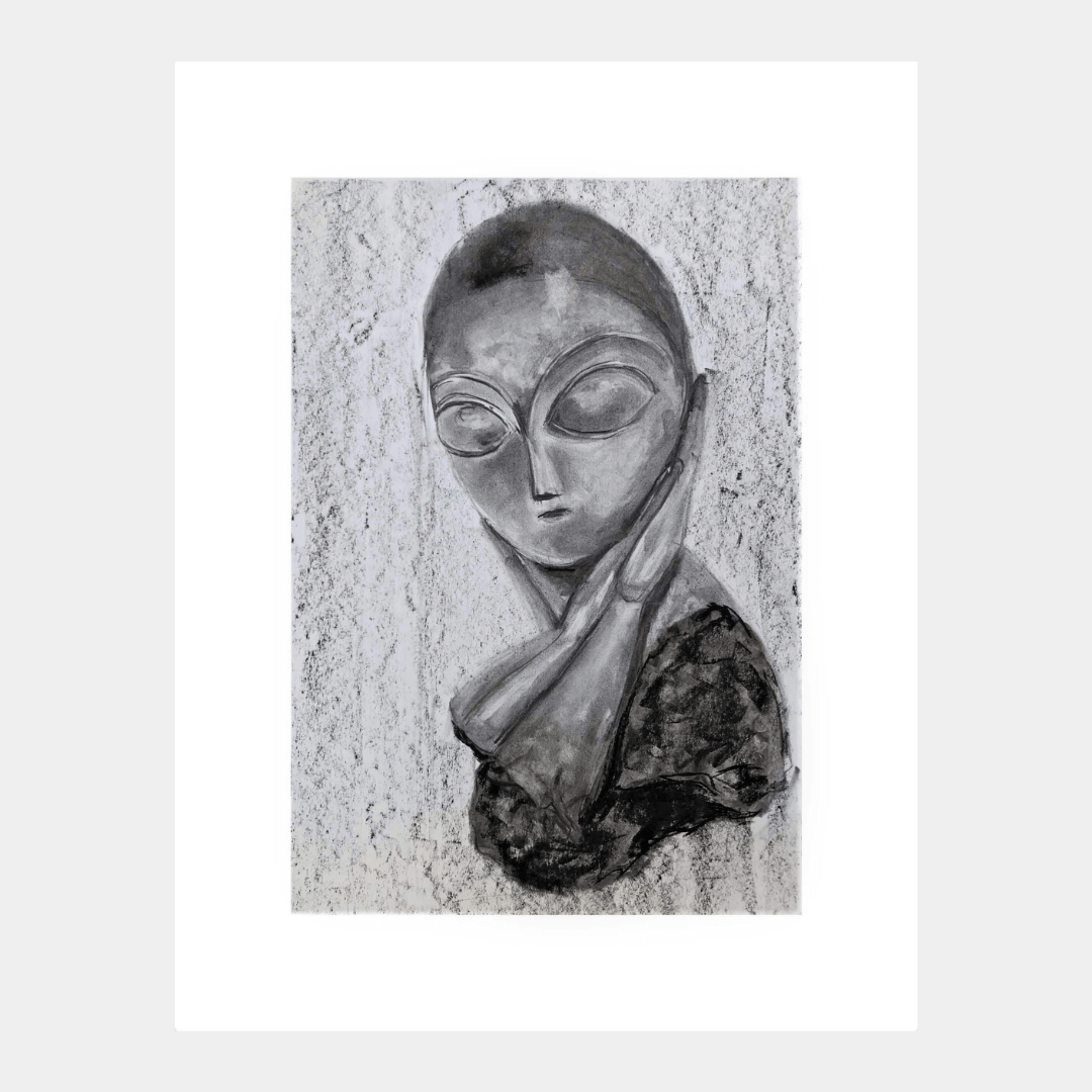 Descriere: Desenul reprezintă un studiu în cărbune după sculptura artistului român, Constantin Brâncuși, intitulată „Domnișoara Pogany”. Lucrarea are un caracter sculptural, fiind redată clar tridimensionalitatea obiectului prin alternarea delumini și de umbre. Spre deosebire de bustul desenat cu treceri omogene între nuanțele de gri, fundalul se află la polul opus, fiind un contrapunct prin tratarea spontană a suprafeței.