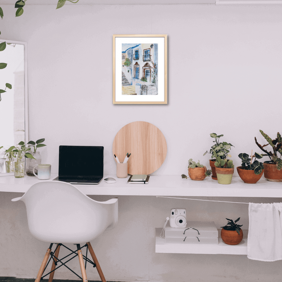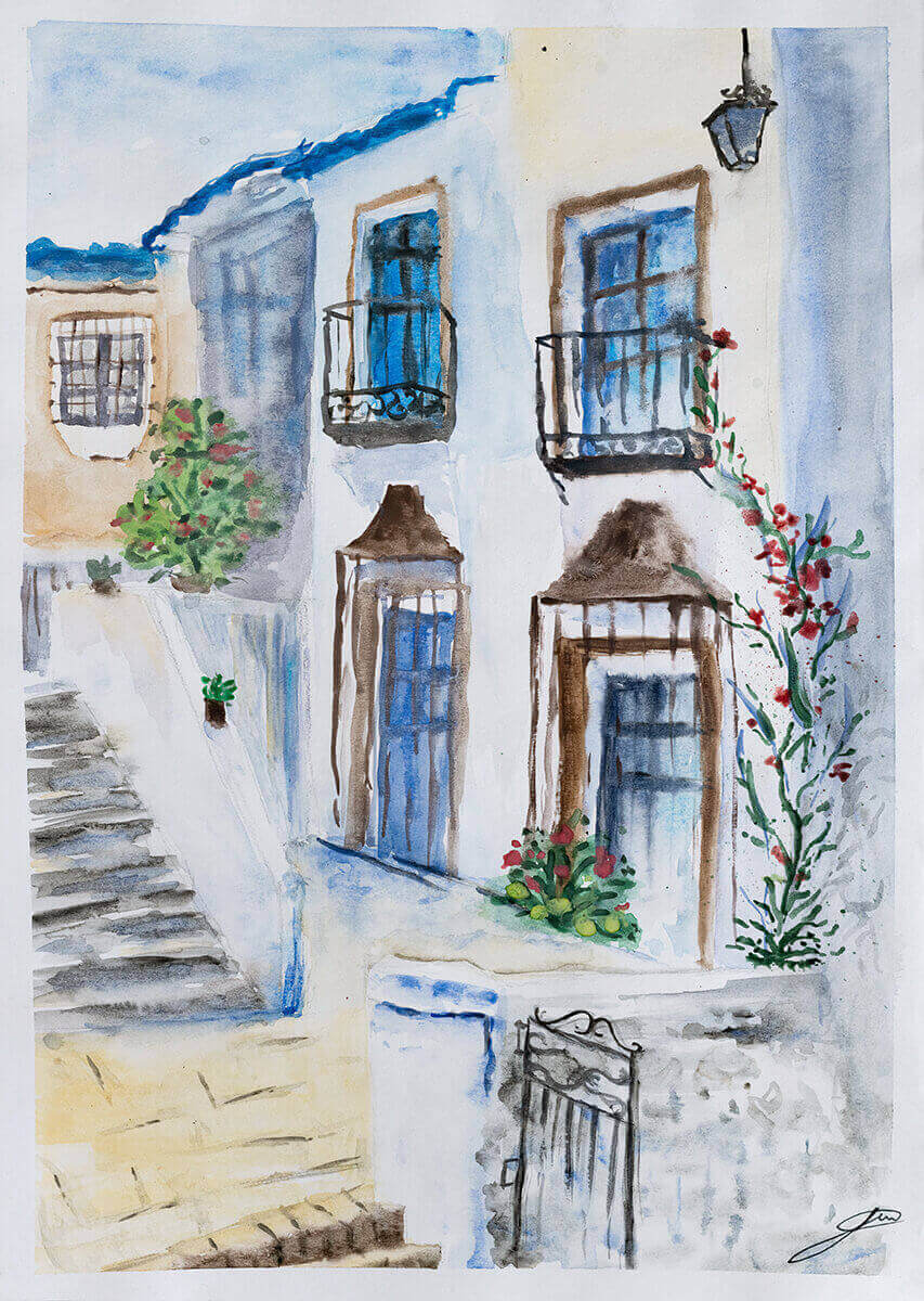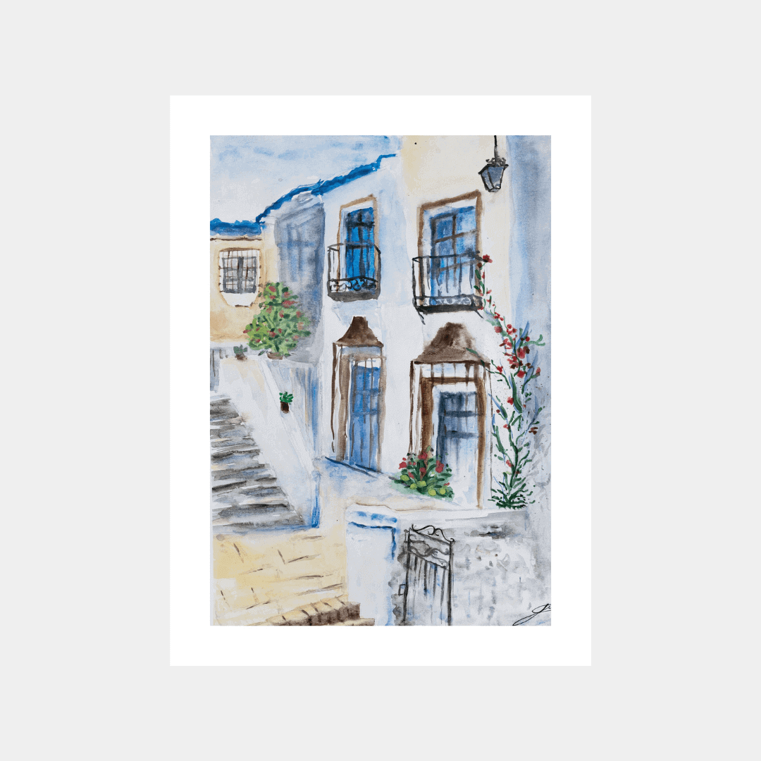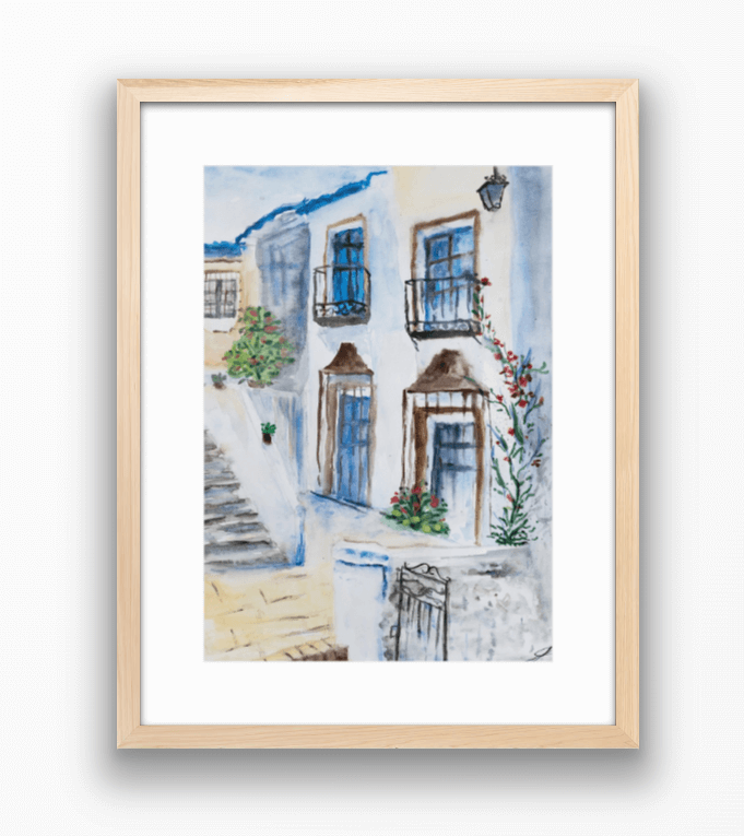 Descriere: Peisajul urban ilustrează un cadru specific Greciei, realizat în tonuri de albastru și alb. Elementele florale