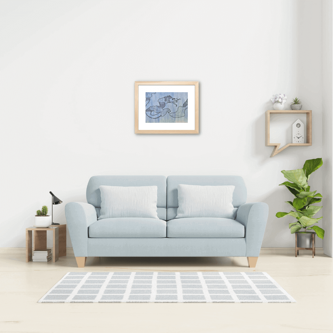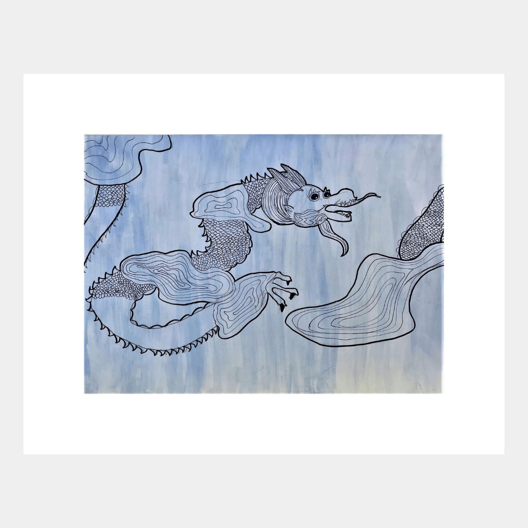 Descriere: Lucrarea are ca personaj reprezentat decorativ un dragon aflat în mișcare. Compoziția dinamică creionată pe un fundal pictural în nuanțe de albastru deschis este extrem de contrastantă prin prisma tratării diferite a suprafelor. Dacă fondul este vibrat și cu tușe libere, dragonul este tratat cu multă atenție la detalii și la calitatea liniei și a petei.