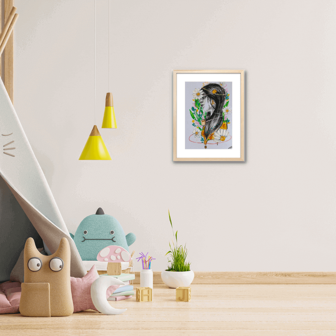 Descriere: Această lucrare realizată în tehnica acuarelei reprezintă un portret plin de creativitate și imaginație. Desenul studiat al feței personajului feminin marchează o manieră realistă de abordare, iar asociererea acestuia cu motive inspirate din natură (flori, frunze), dar și cu anumite simboluri, aduce un plus de originalitate în ceea ce privește tratarea clasicului studiu de portret.