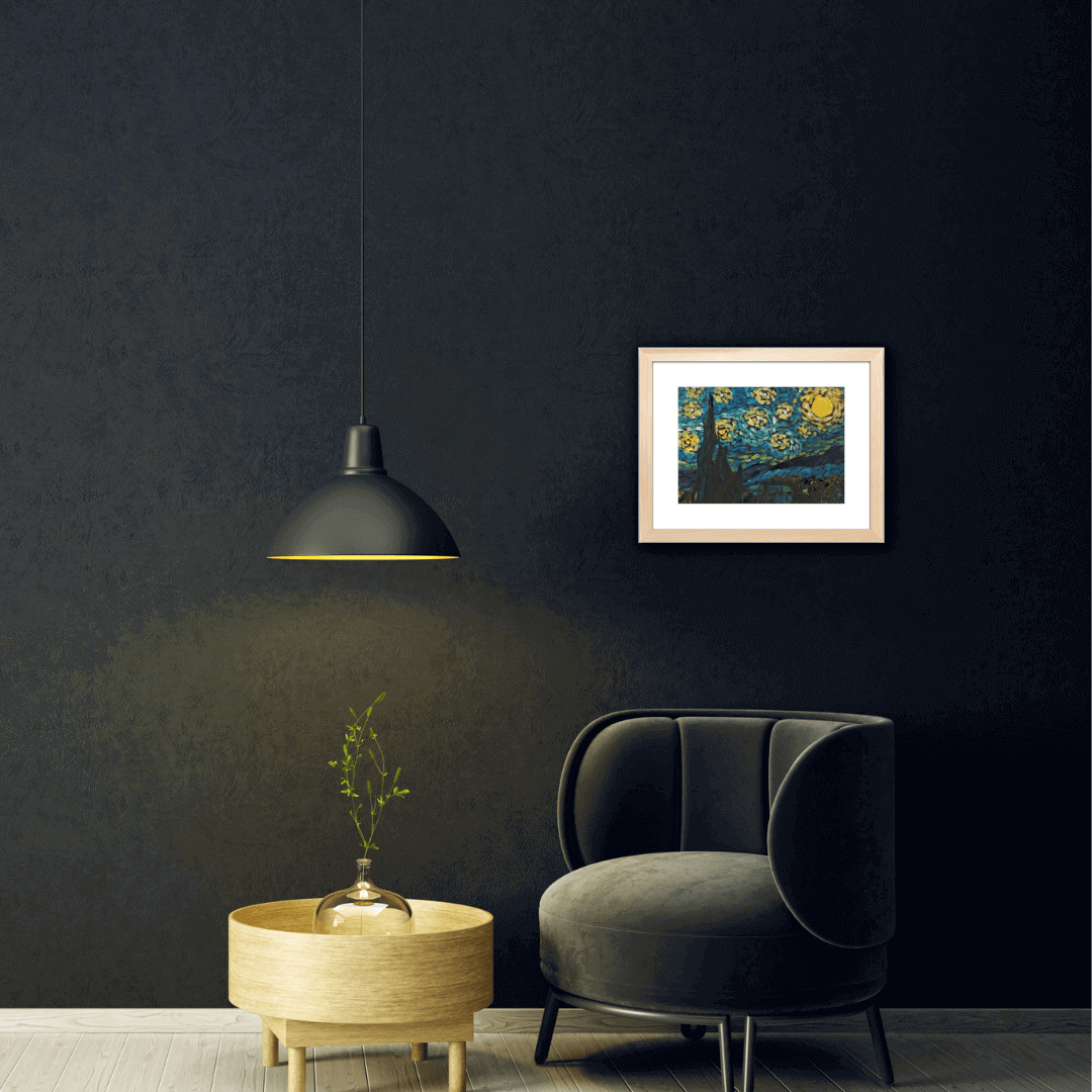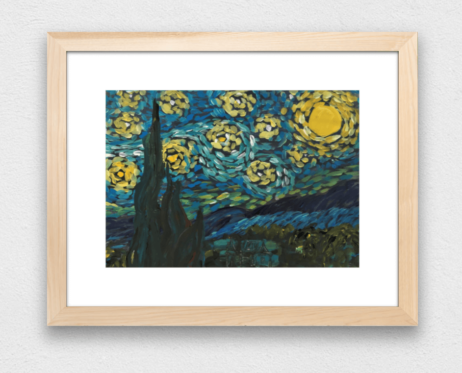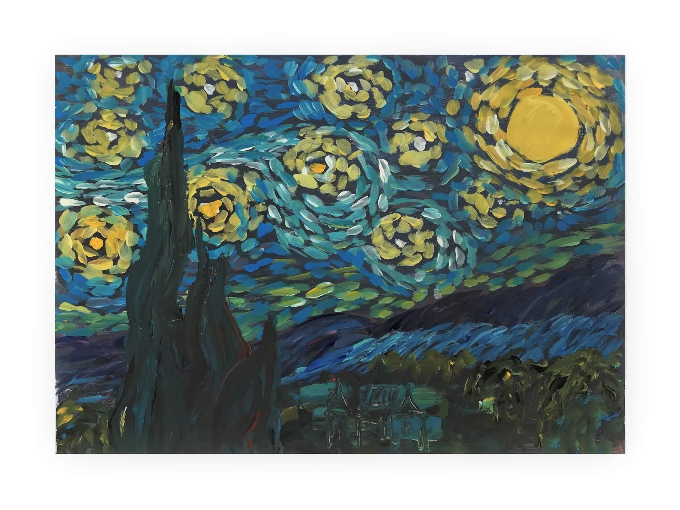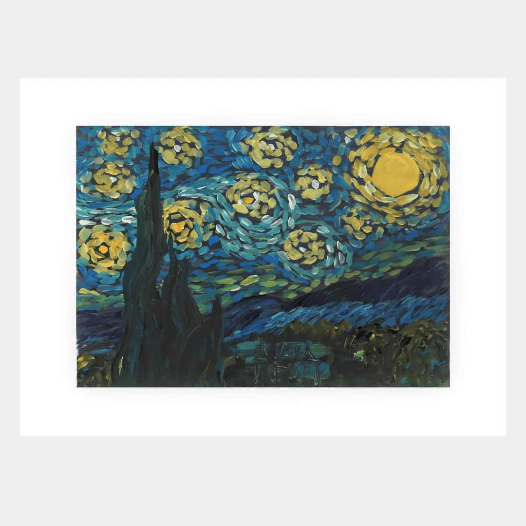 După lucrarea Noapte înstelată de Vincent Van Gogh. Compoziția realizată conține tușe pline de pastă, spontane, aranjate într-o ritmicitate circulară și este bazată pe nuanțe de albastru, galben și negru, dar și pe variațiuni cromatice ale acestora. Lucrarea reprezintă un studiu după celebrul tablou al lui Van Gogh și mai ales după stilul său aparte de a picta.