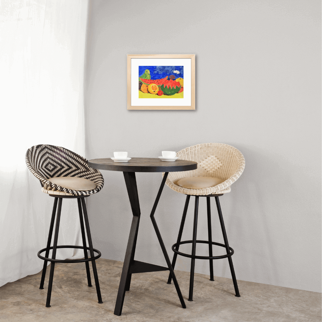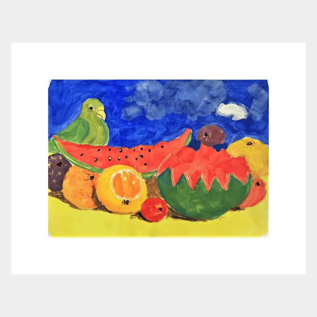 Descriere: Lucrarea este o reinterpretate a celebrei compoziții ”Papagal și Fruct” de Frida Kahlo, fiind modificată tehnica de realizare. Astfel, pictura este realizată în tehnica acuarelei, devenind extrem de picturală. Culorile utilizate marchează contraste complementare între perechile albastru-oranj și roșu-verde, conturând atmosfera plină de viață a anotimplului cald.