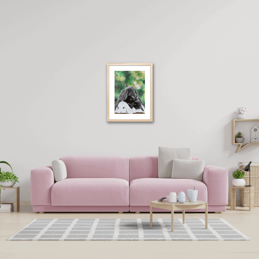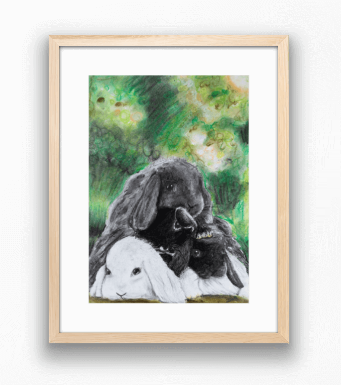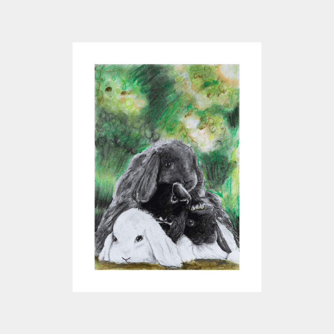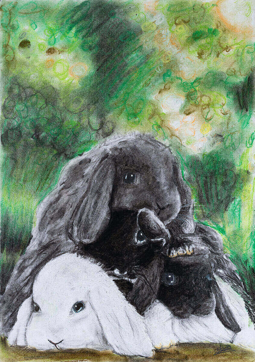 Descriere: Lucrarea centrează niște iepurași îmbrățișați, plasați într-un areal natural, verde. Desenul, la prima