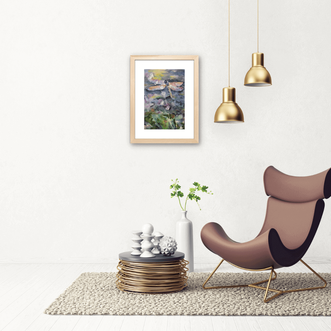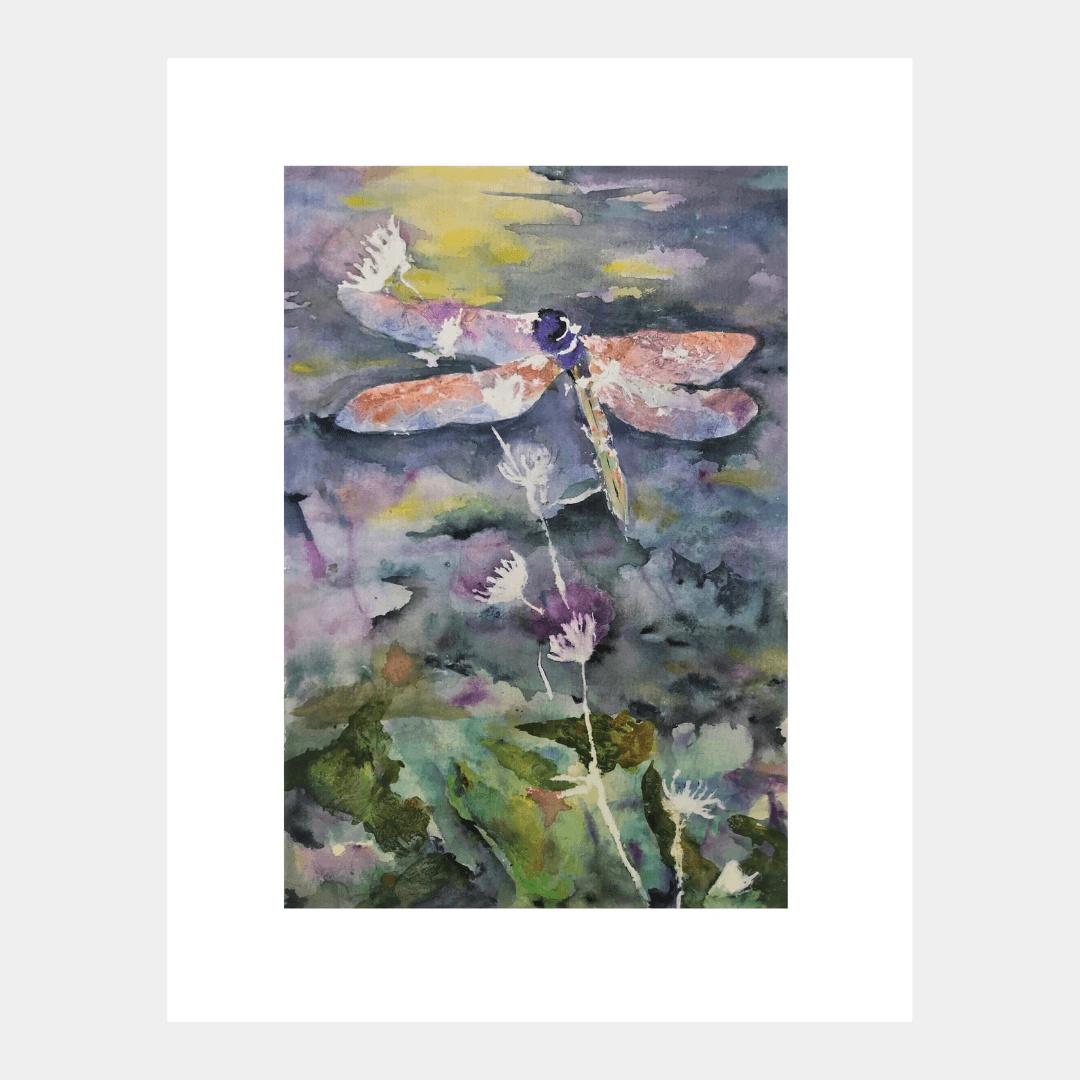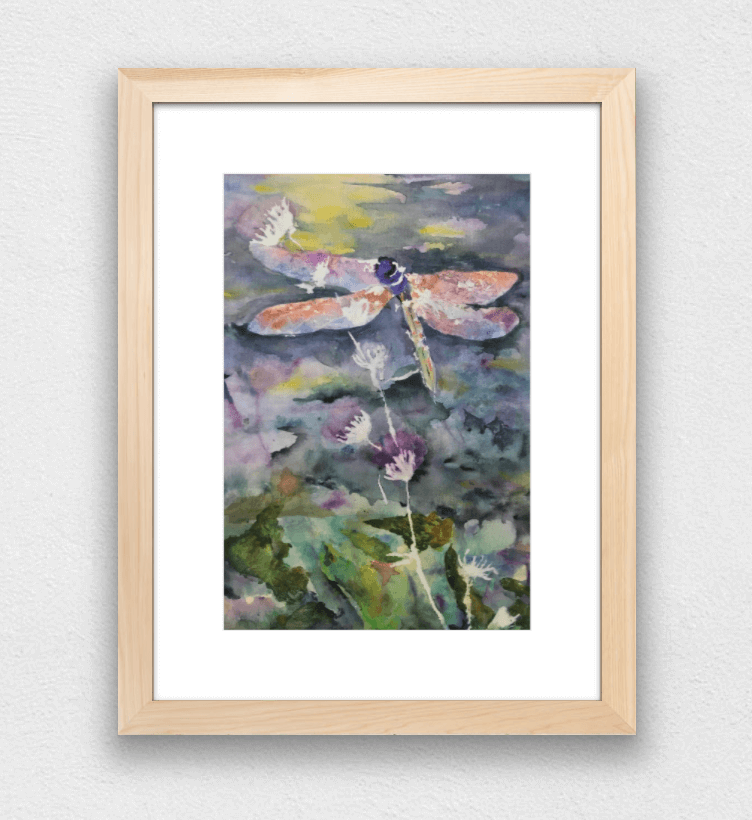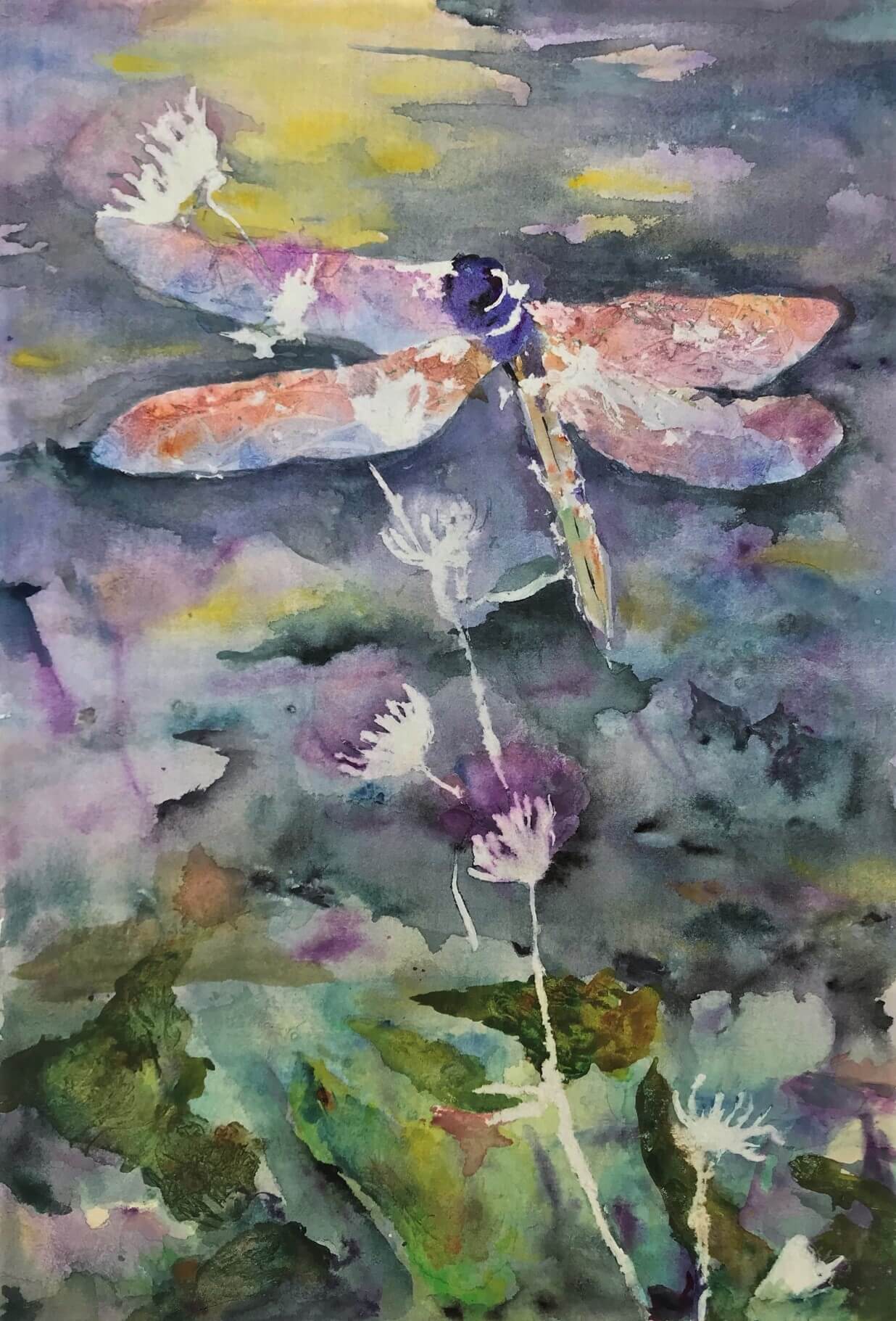 Lucrarea realizată în acuarelă surprinde în prim plan o libelulă, care are în spate un fundal abstract, în nuanțe de violet, verde și galben. Pictura redă un stop-cadru din momentul zborului și captează atenția privitorului prin accentul pus pe insectă și planta schițată în alb. Artista dovedește o abordare originală a naturii și provoacă privitorul să contempleze asupra lucrării.